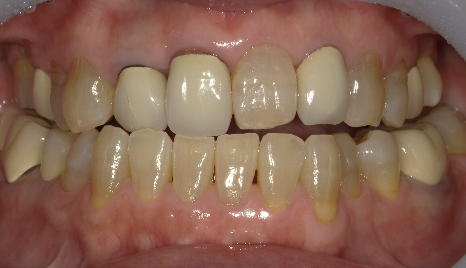 20年以上前のメタルボンドによる差し歯で、歯肉が下がり根元の黒い影と歯の間のすきまも黒く見えていました。 ジルコニアセラミックを使用して周りの歯と形や色を調和させて自然な色味でやり直しをしました。