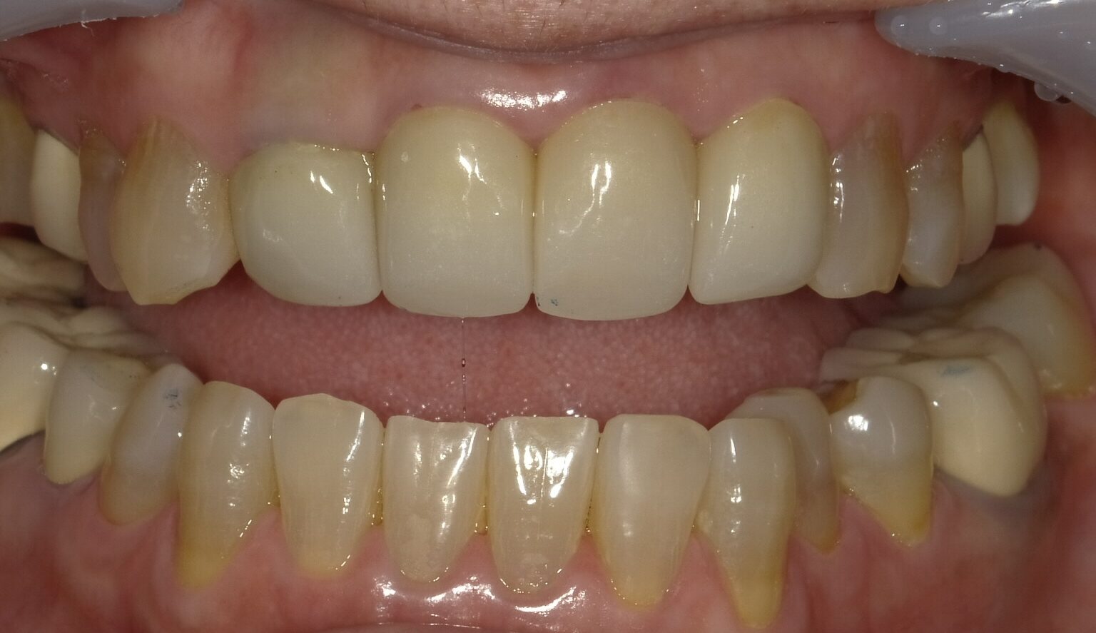 - 歯肉が下がり、差し歯の境目が見えてきた