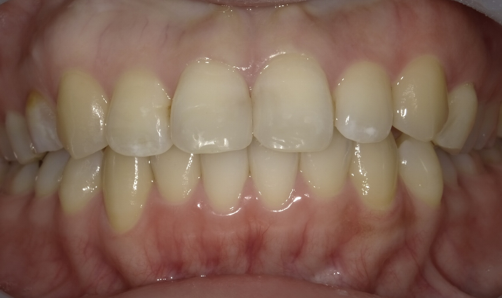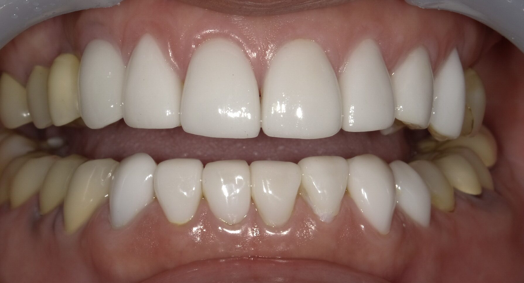 全体的な黄ばみと、前歯2本の差し歯の色ズレが目立っていたケースです。差し歯以外はホワイトニングで明るくし、その色に合わせてジルコニアセラミッククラウンを作製しました。