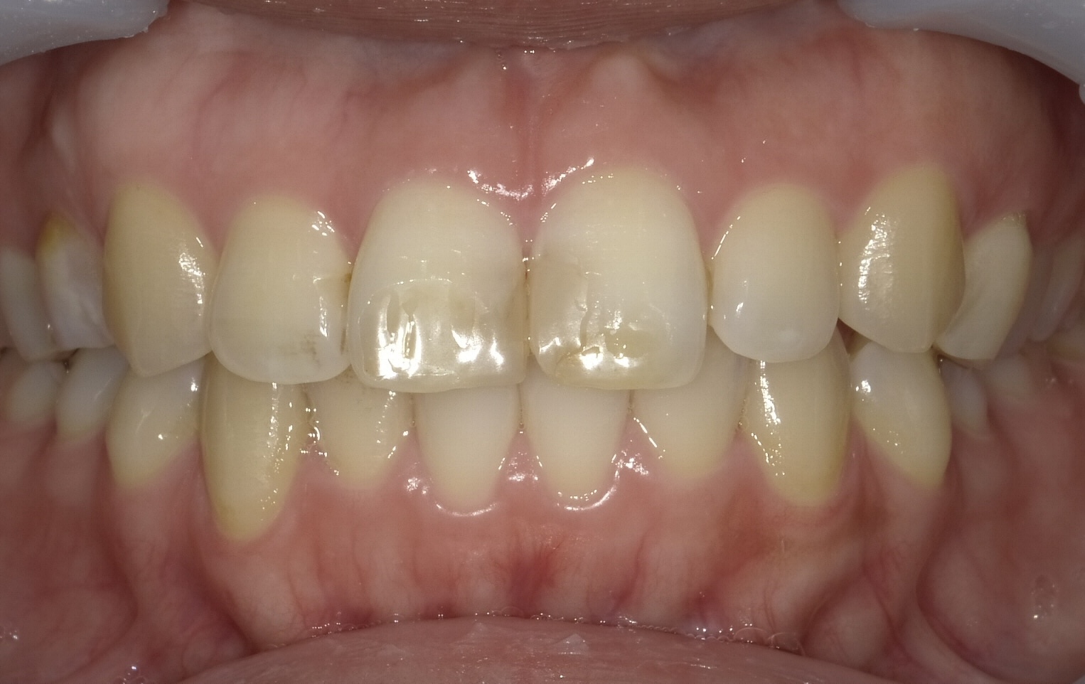 前歯の表面に詰め物跡が広く、色ムラが目立つ状態。歯も薄く、レジンの詰め替えを繰り返すより、質感から整えたいケース。